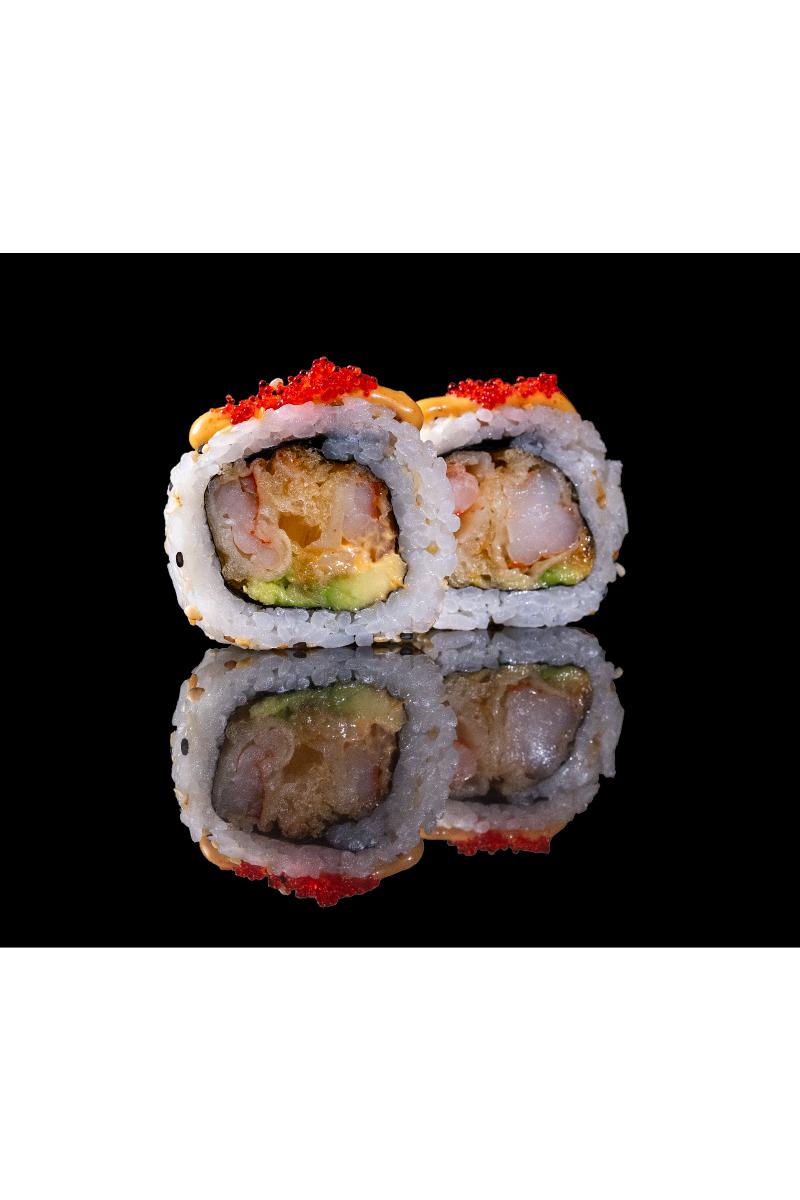 Stekt scampi, avokado, sesamfrø, krydret saus, flygefiskkaviar. Inneholder: Hvete, skalldyr, egg, sesamfrø, fisk, soya, sennep