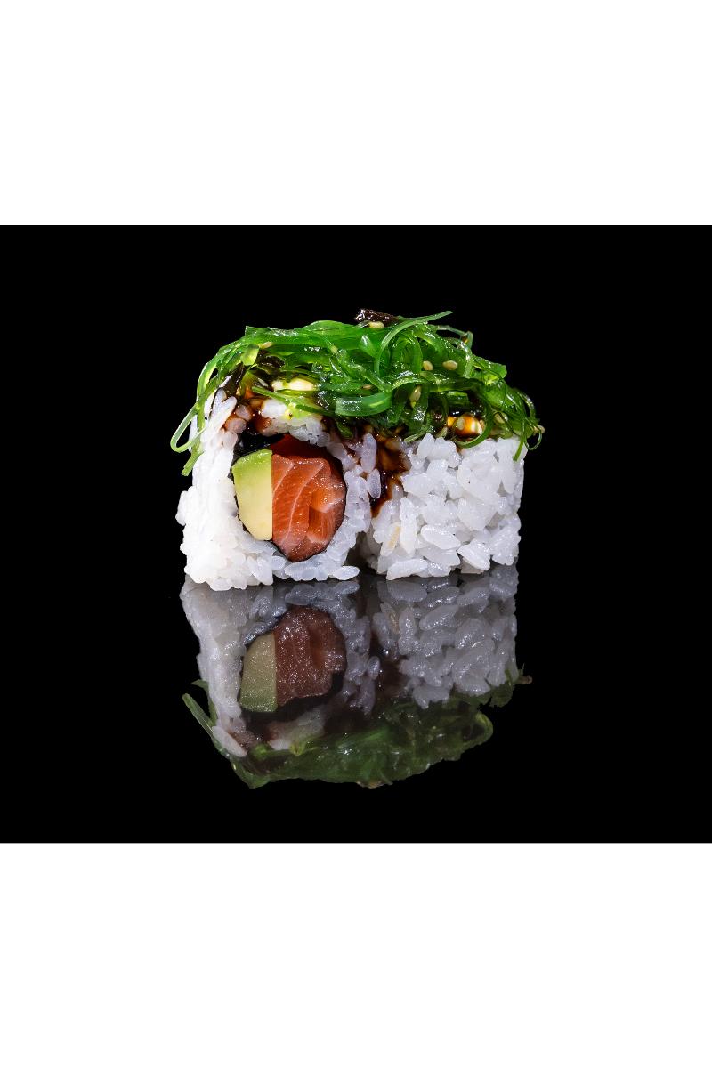 Laks, avokado, agurk, sjøgress, majones, teriyaki saus. Inneholder: Fisk, hvete, egg, soya, sennep, sesam.