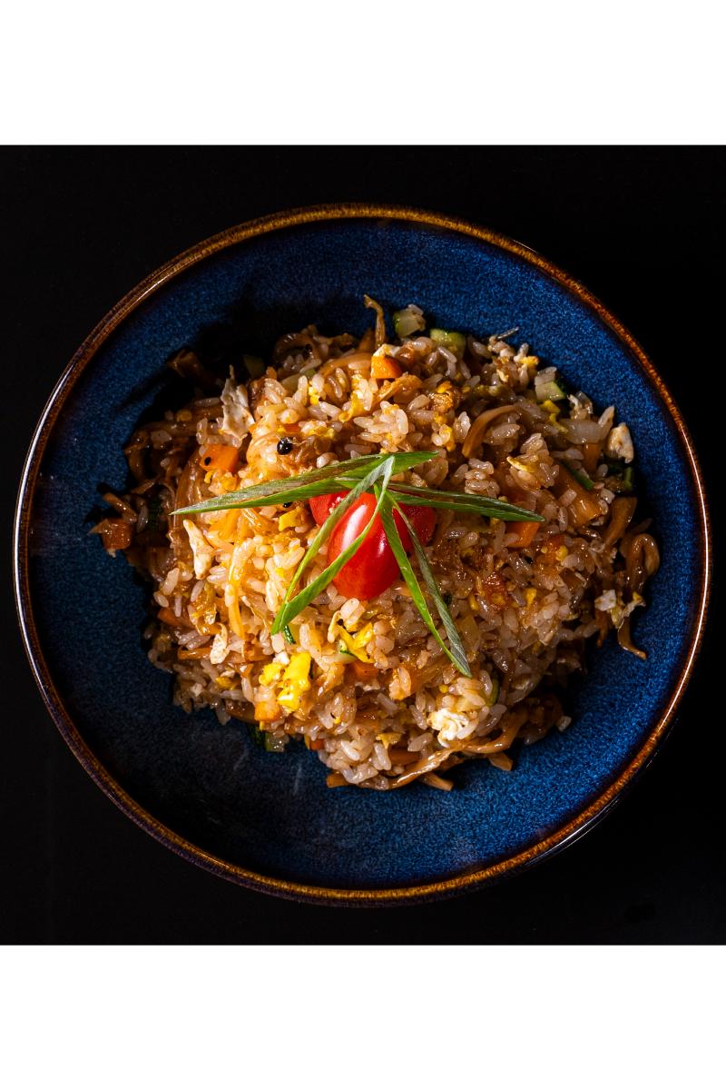 Kimchi stekt ris med grønnsaker. Inneholder: Sesam, egg, hvete, soya