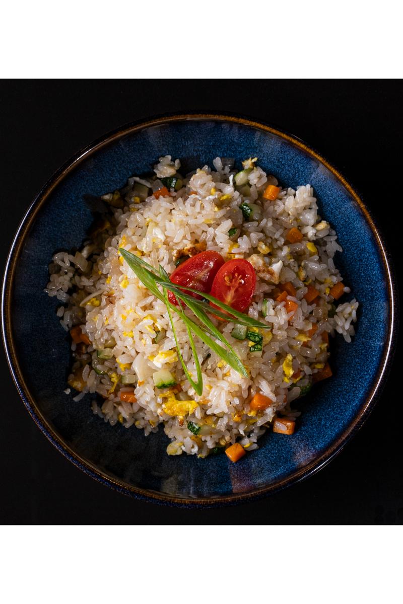 Stekt ris med grønnsaker. Inneholder: Sesam soya, egg, hvete