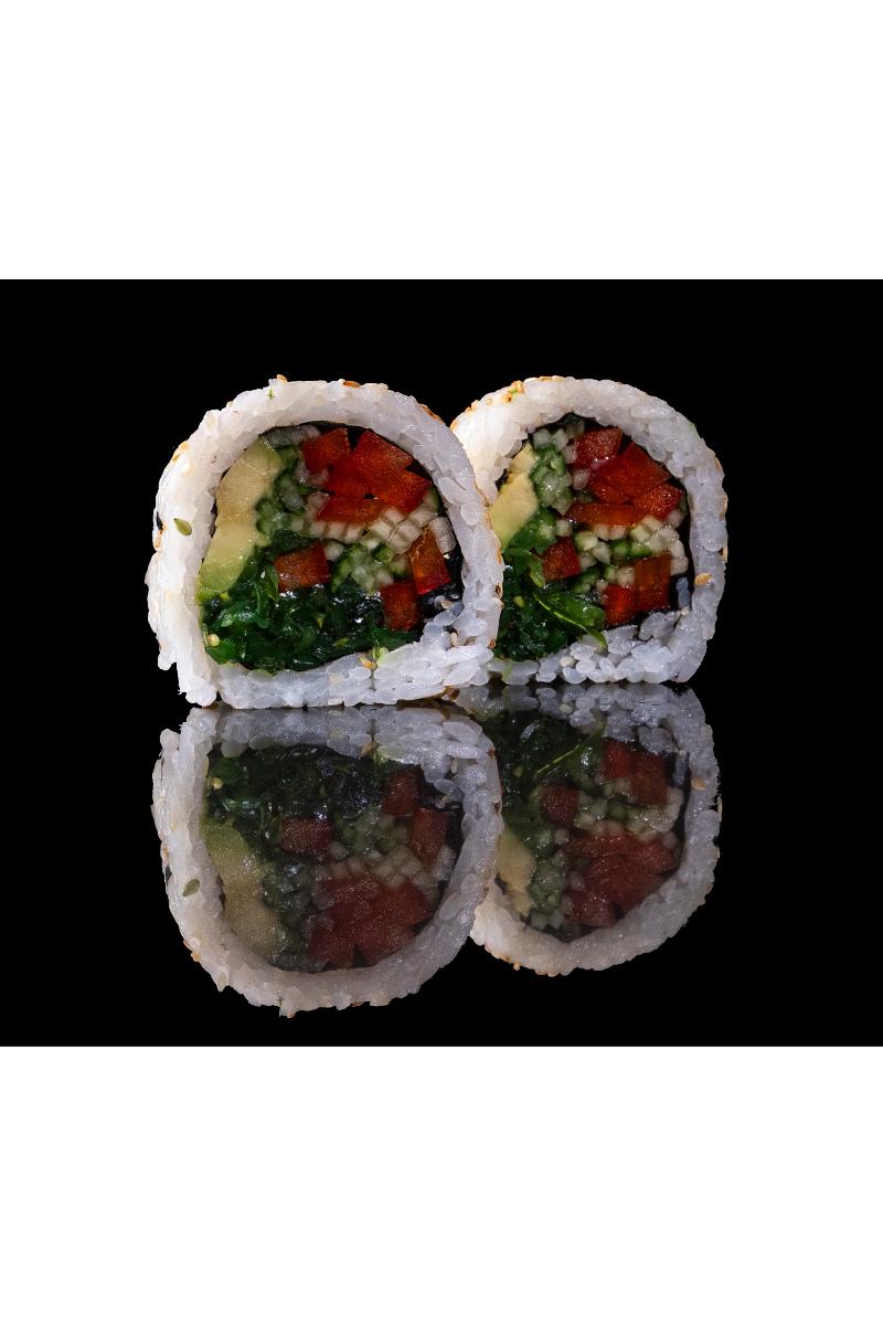 Paprika, agurk, avokado, sesamfrø, sjøgress. Inneholder: Sesamfrø, egg, hvete, soya, sennep