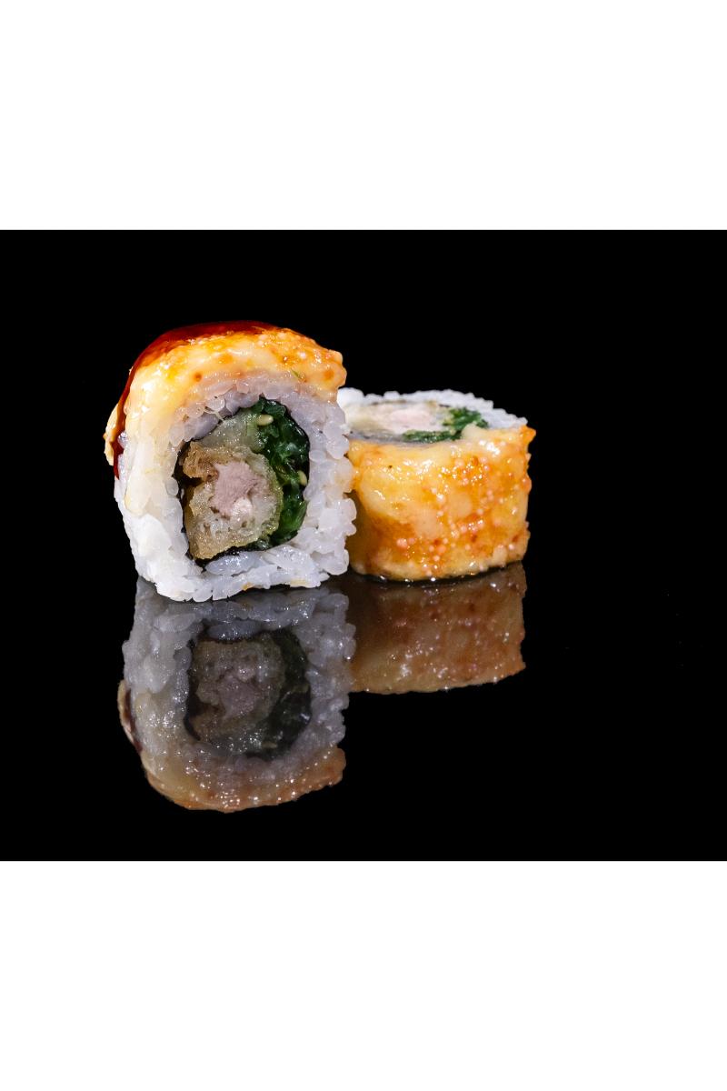 Tempura kylling, ananas, sjøgress, krydret saus, majones, ost. Inneholder: Hvete, egg, soya, sennep, sesam.
