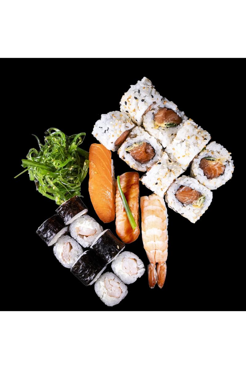 Yumi maki, Hashi maki, 1 laks nigiri, 1 sake flambe nigiri, 1 scampi nigiri, sjøgress. Inneholder: Fisk, egg, hvete, sesamfrø, soya, sennep, melk