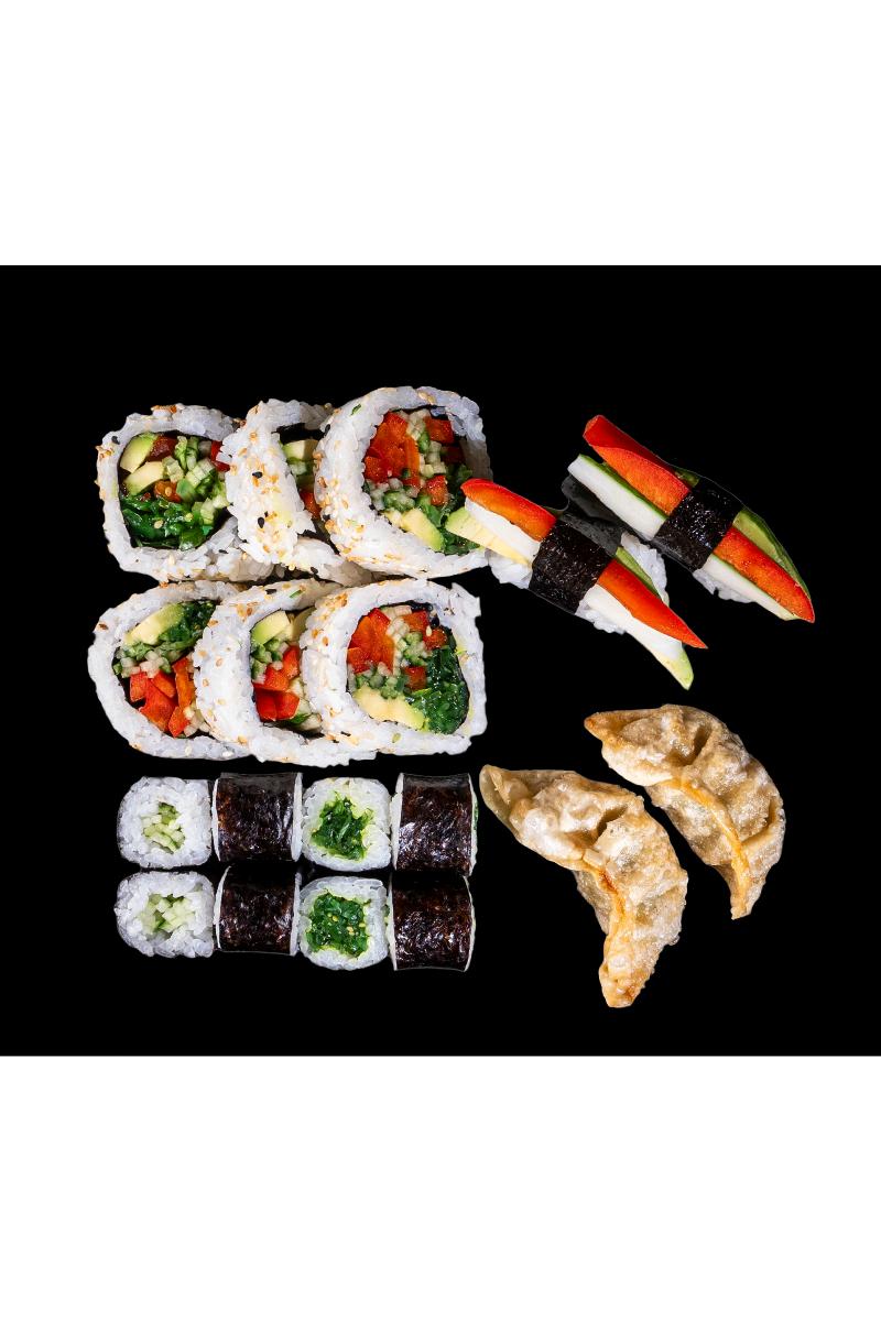 Yasai maki, 1/2 Kappa maki, 1/2 Kaiso maki, 2 grønnsaker nigiri, dumplings med grønnsaker 2 stk, sjøgress. Inneholder: Sesamfrø, soya, sennep, hvete.