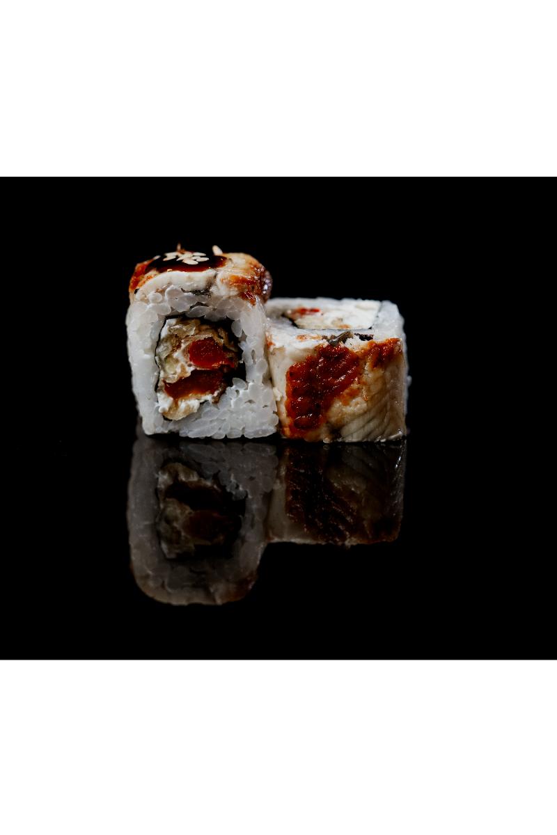 Røkt ål, philadelphiaost, squash, aubergine, teriyaki saus. Inneholder: Fisk, melk, sesamfrø, hvete, soya, sennep