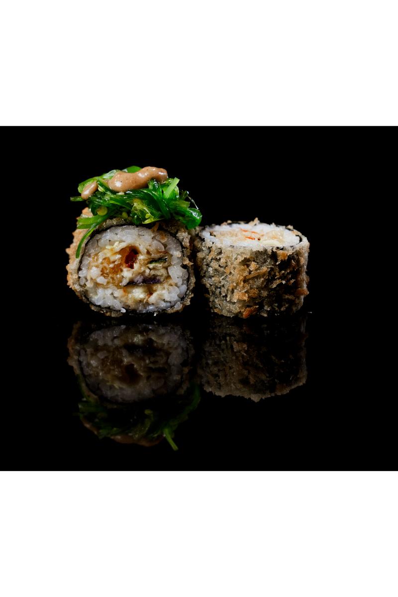 Paprika, squash, aubergine, sjøgress, majones, peanøttsaus. Inneholder: Hvete, soya, sennep, sesamfrø