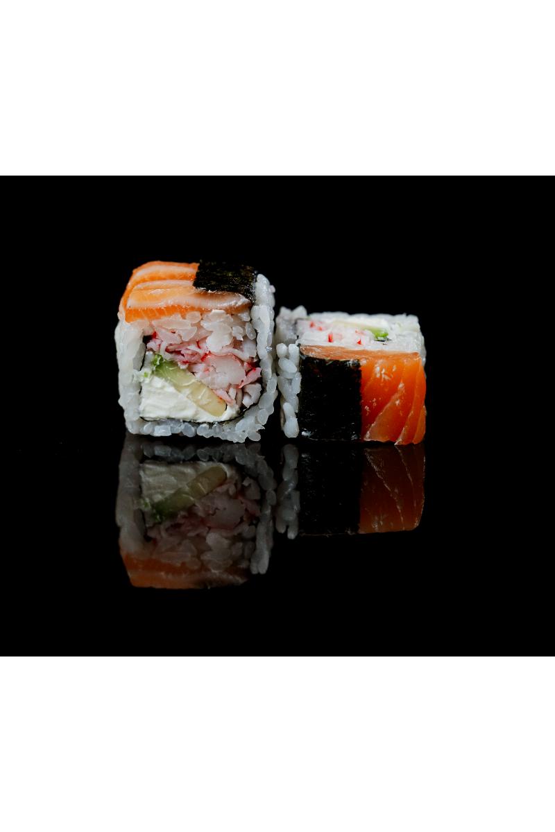 Laks, philadelphia ost, avokado, surimi. Inneholder: Fisk, hvete, melk, soya, sennep, egg, skalldyr